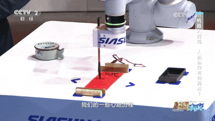 新松多可协作机器人在《直通未来——“智造”未来的三维革命》节目中与主持人互动▼