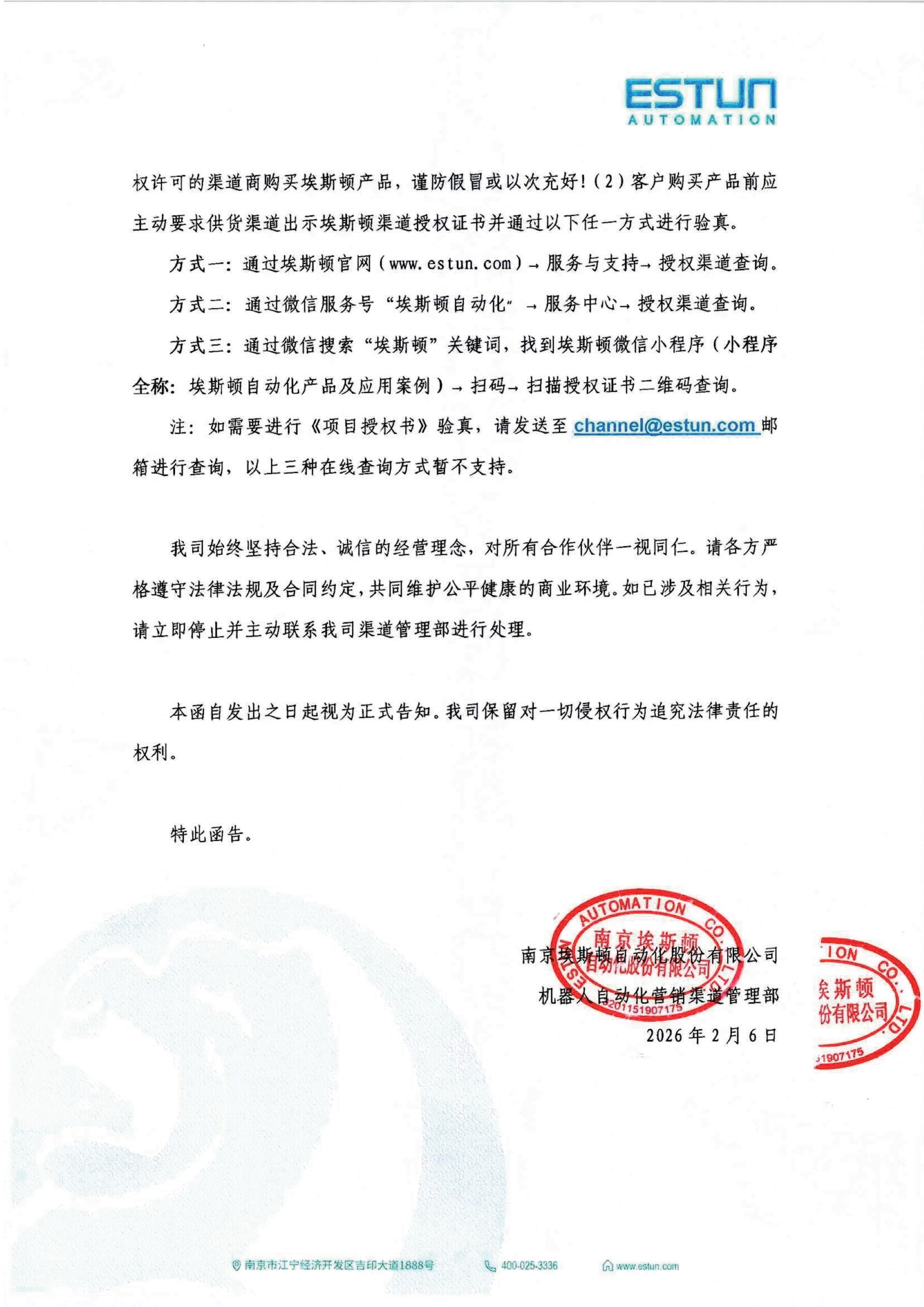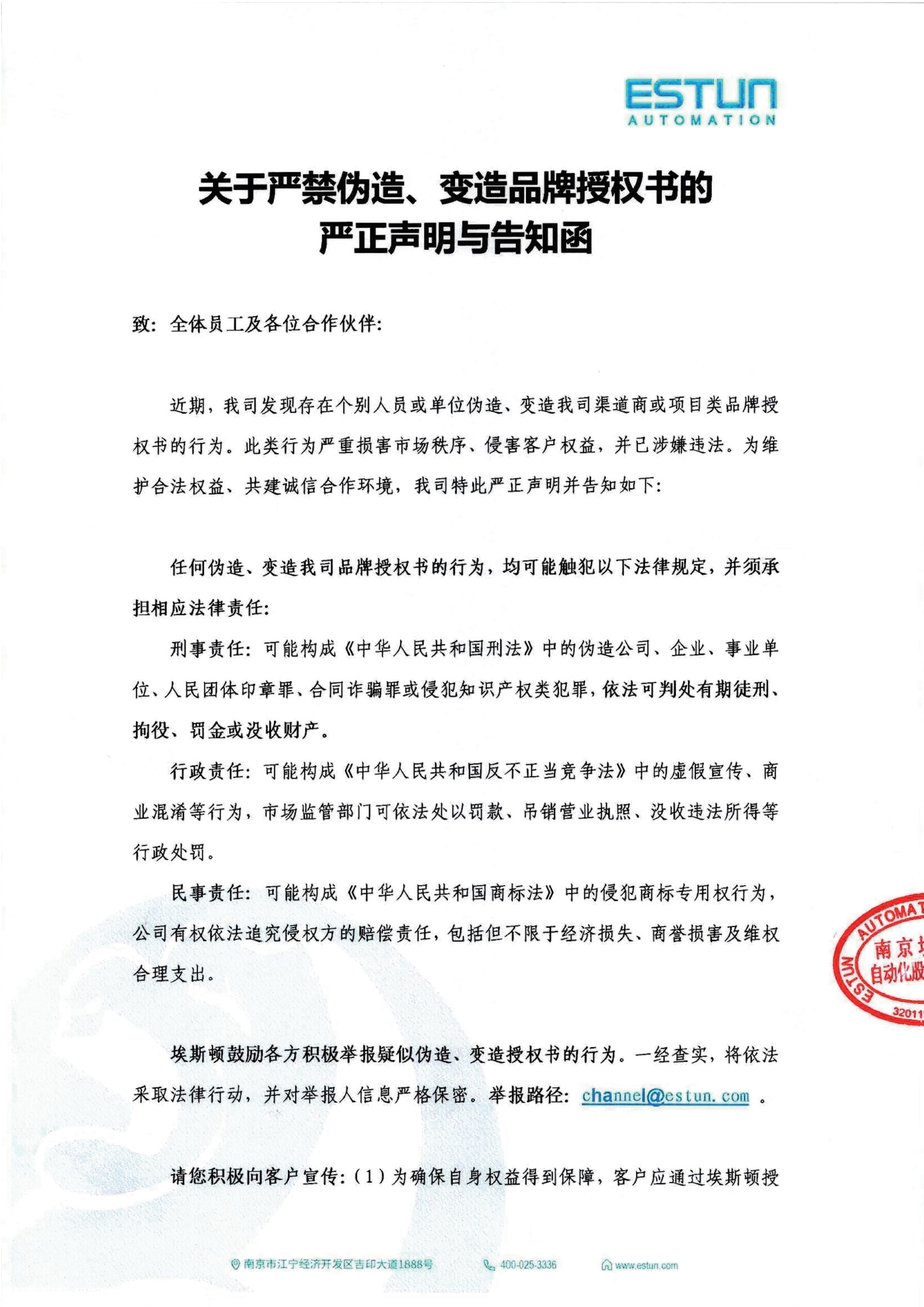 告知函〡关于严禁伪造、变造品牌授权书的严正声明与告知函 埃斯顿自动化 (ESTUN) 行业资讯 estun automation pdf 告知函 关于严禁伪造 变造品牌授权书的严正声明与告知函 埃斯顿自动化 正文 告知函纸质版 埃斯顿自动化-ESTUN AUTOMATION 正文 告知函纸质版.pdf 打开原文